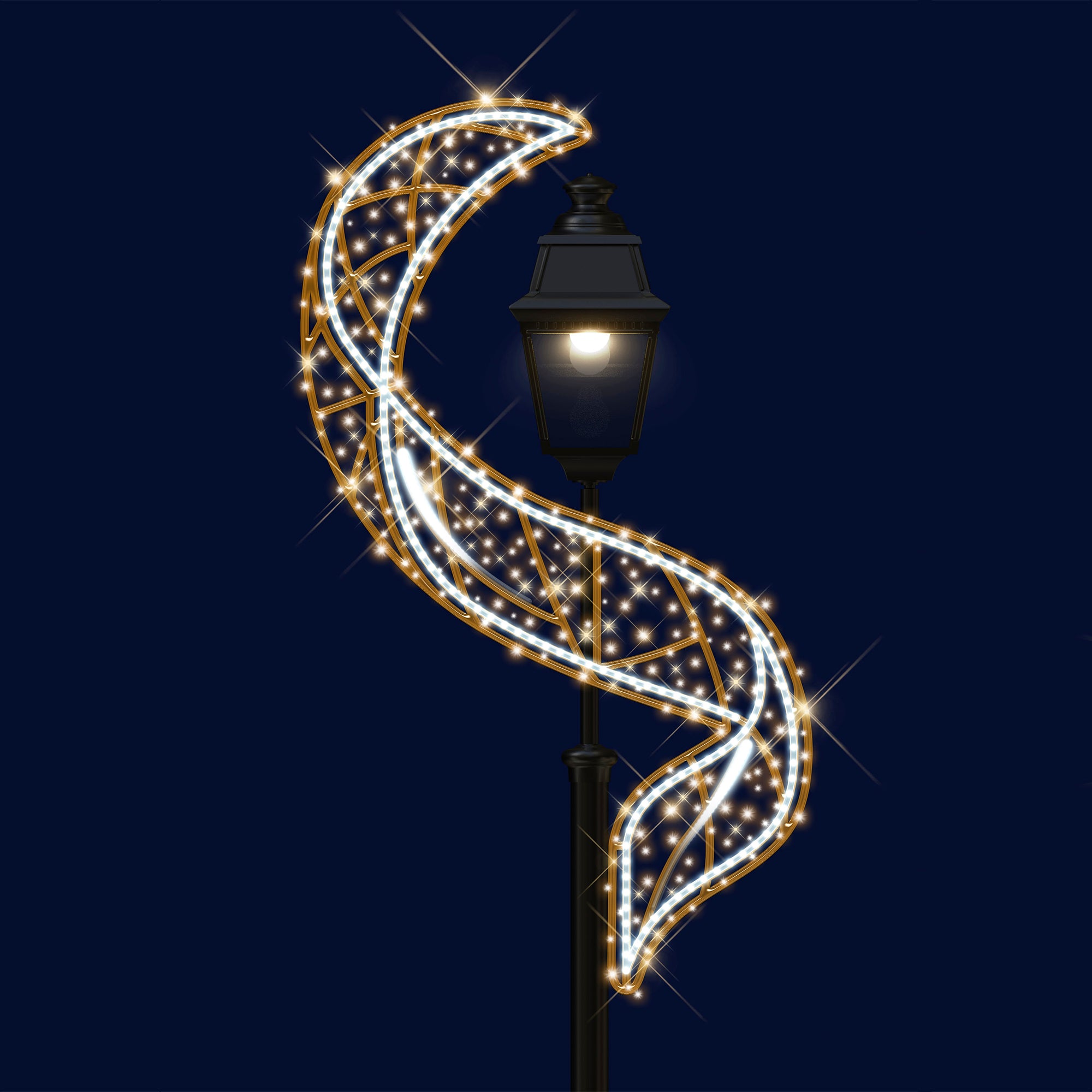A glittering refurbished lamp post motif design with white and warm white LED rope lights and warm white LED string lights with white LED strobe lights.